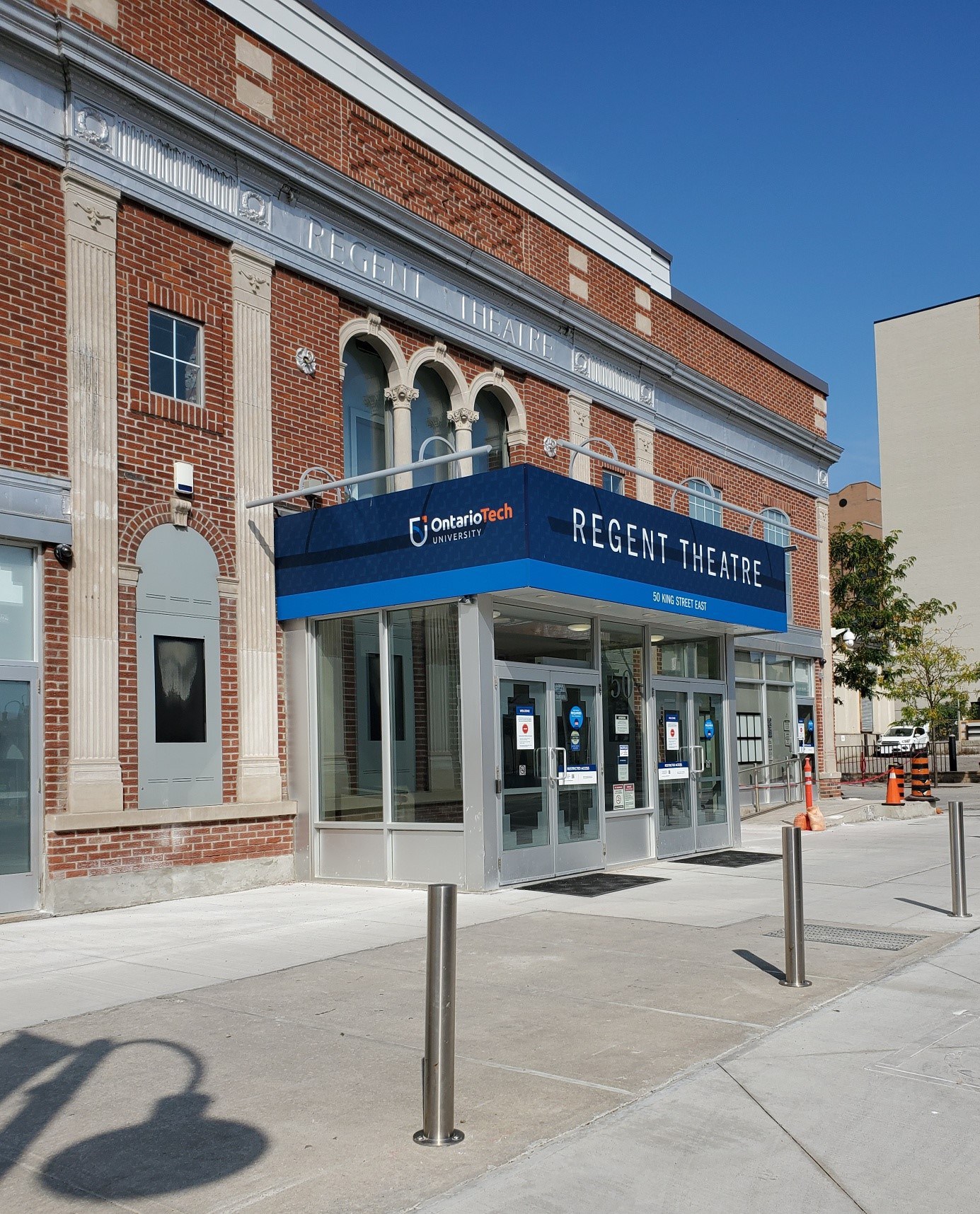 Le Regent Theatre a été construit en 1919, et sa façade sur King Street présente des lignes architecturales géorgiennes symétriques. Il est l’un des rares exemples restants de ce style architectural d’inspiration classique à Oshawa. Construit à l’origine pour les théâtres Famous Players, il a été fermé pendant plusieurs années avant d’être rouvert en 2010 en tant qu’amphithéâtre pour l’Université Ontario Tech.