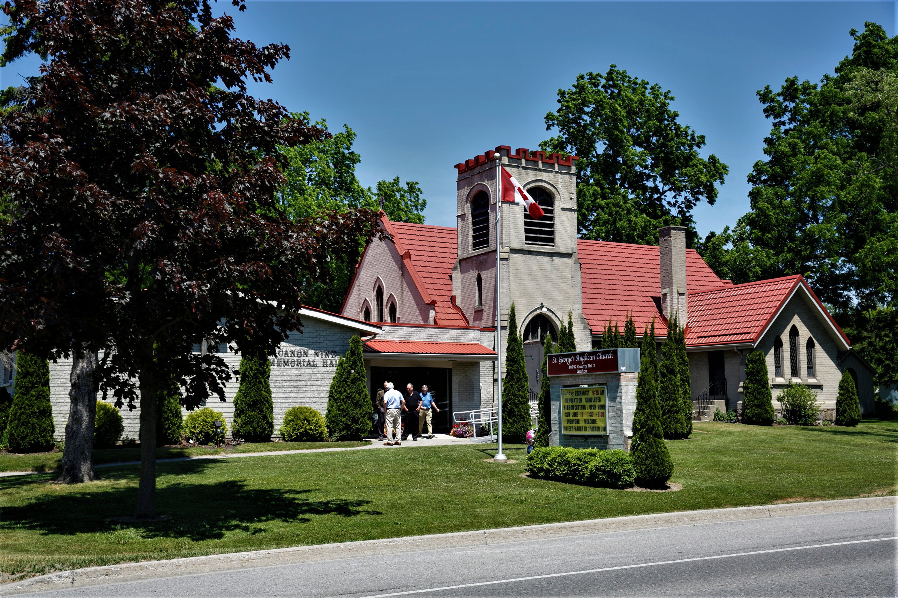 2019 marks the 175th anniversary of St. George's Anglican Church in Grafton. Although the 1844 wooden structure was destroyed by fire in 1908, the current brick church was opened just 10 months later. Designed by Grant Helliwell, the "church with the red roof" features a bell tower with battlements and Gothic-style buttresses and windows.