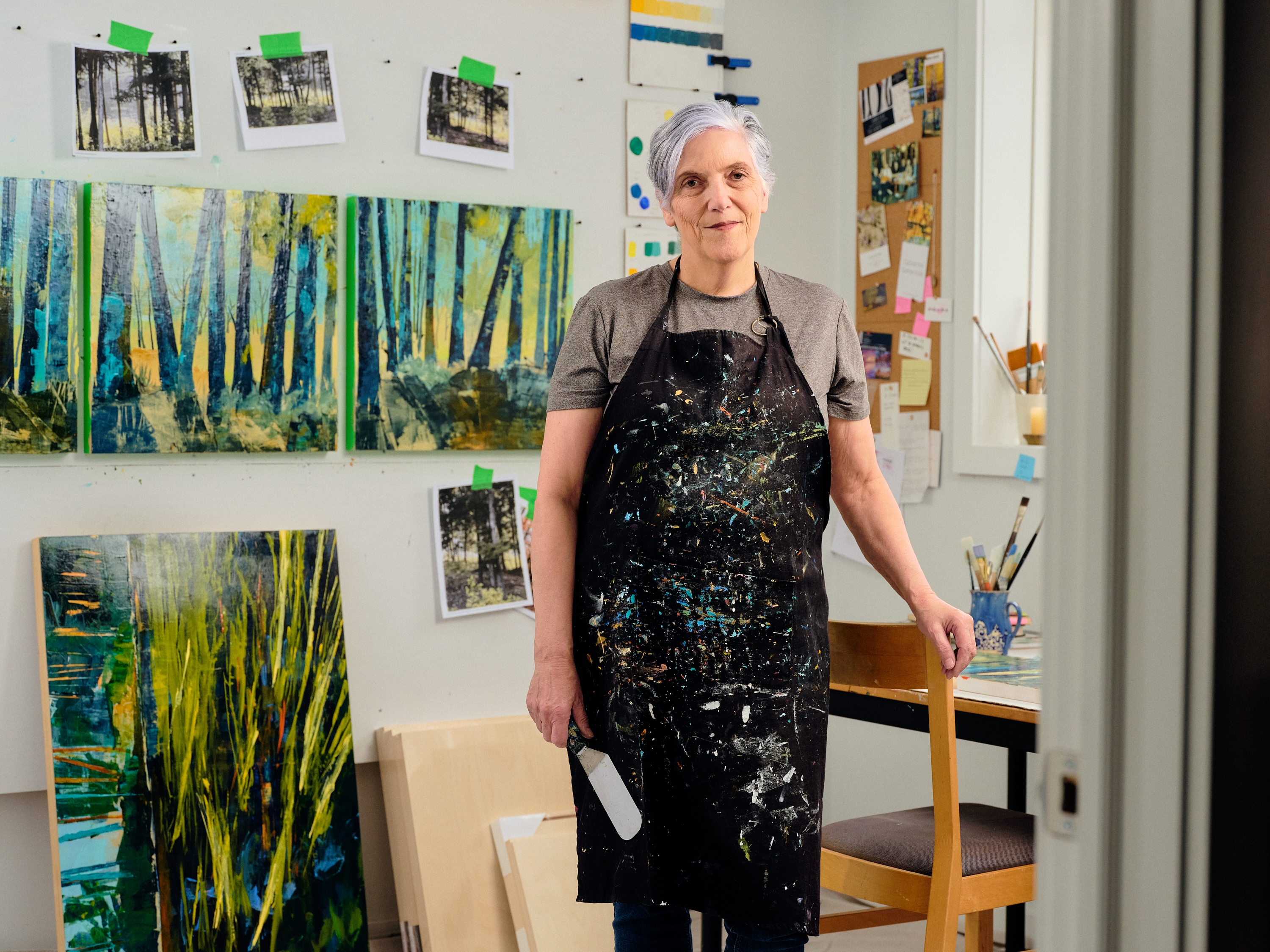 This studio features the work of Helen Grace Agalawatte, inspired by journeys north of Toronto and the rugged beauty of Ontario’s lakes, rocks, and forests. Working on cradled wood panels, her layered paintings, created using unconventional tools, capture the wild, unpredictable energy of the landscape.